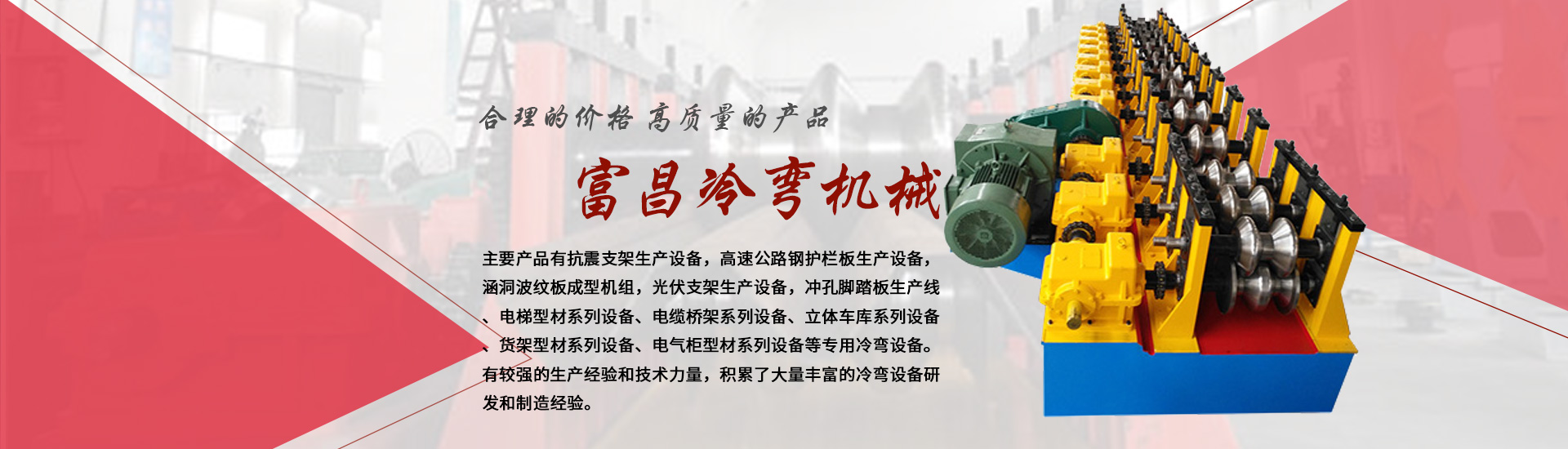 主要產(chǎn)品有抗震支架生產(chǎn)設(shè)備,高速公路鋼護欄板生產(chǎn)設(shè)備,涵洞波紋板成型機組,光伏支架生產(chǎn)設(shè)備,沖孔腳踏板生產(chǎn)線、電梯型材系列設(shè)備、電纜橋架系列設(shè)備、立體車庫系列設(shè)備、貨架型材系列設(shè)備、電氣柜型材系列設(shè)備等專用冷彎設(shè)備。有較強的生產(chǎn)經(jīng)驗和技術(shù)力量,積累了大量豐富的冷彎設(shè)備研發(fā)和制造經(jīng)驗。